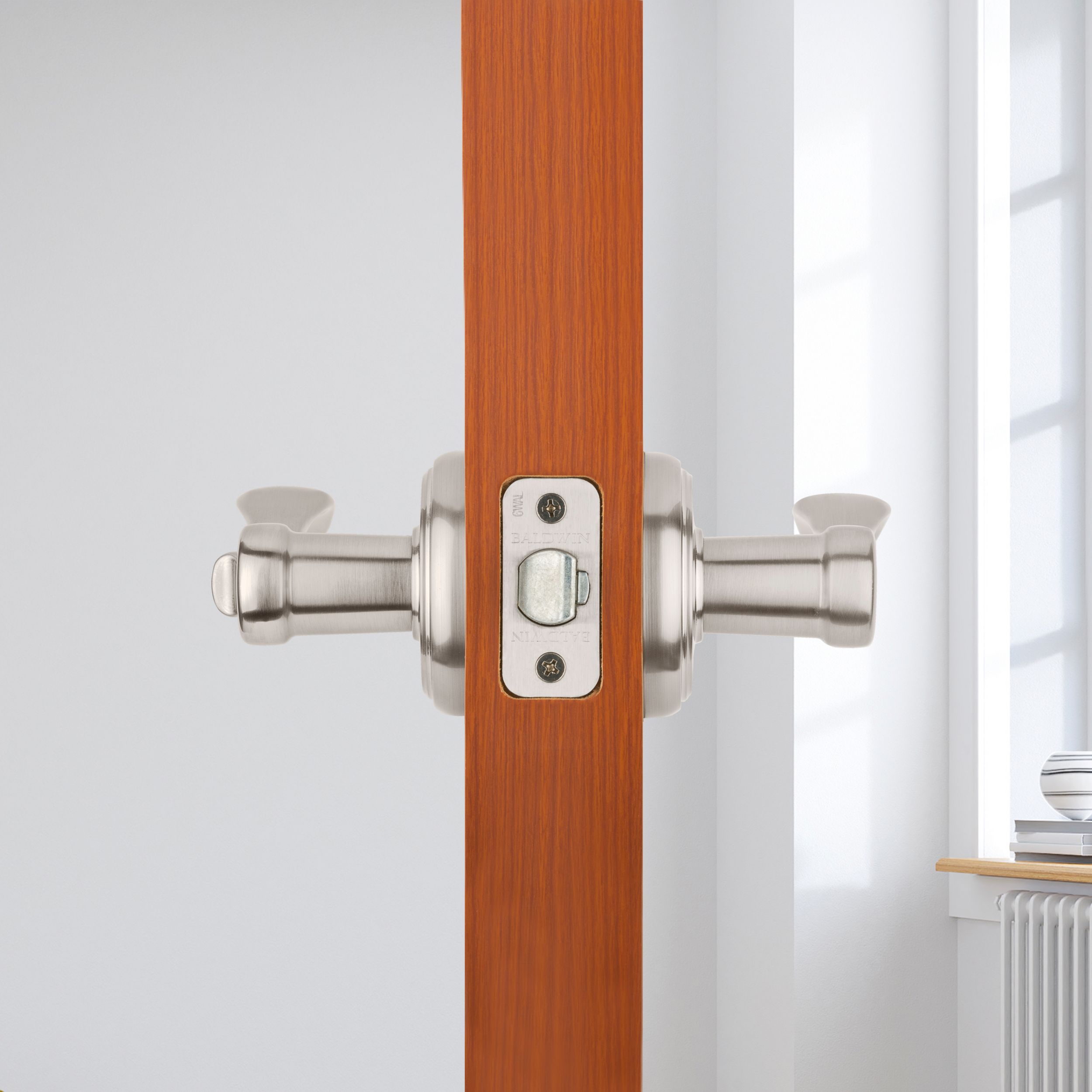 Knob or lever set paired with roses with a privacy lock to both close and secure any door with the 2.125" standard door preparation.